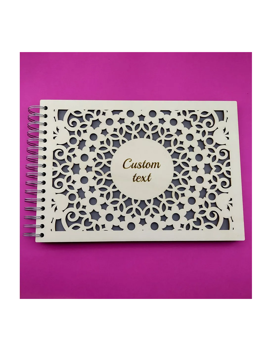 - Individuell gestaltet: Wunschname oder kurzer Text werden in die Mitte des Covers graviert – eingerahmt von einem kunstvoll ausgeschnittenen Blumenmuster.
