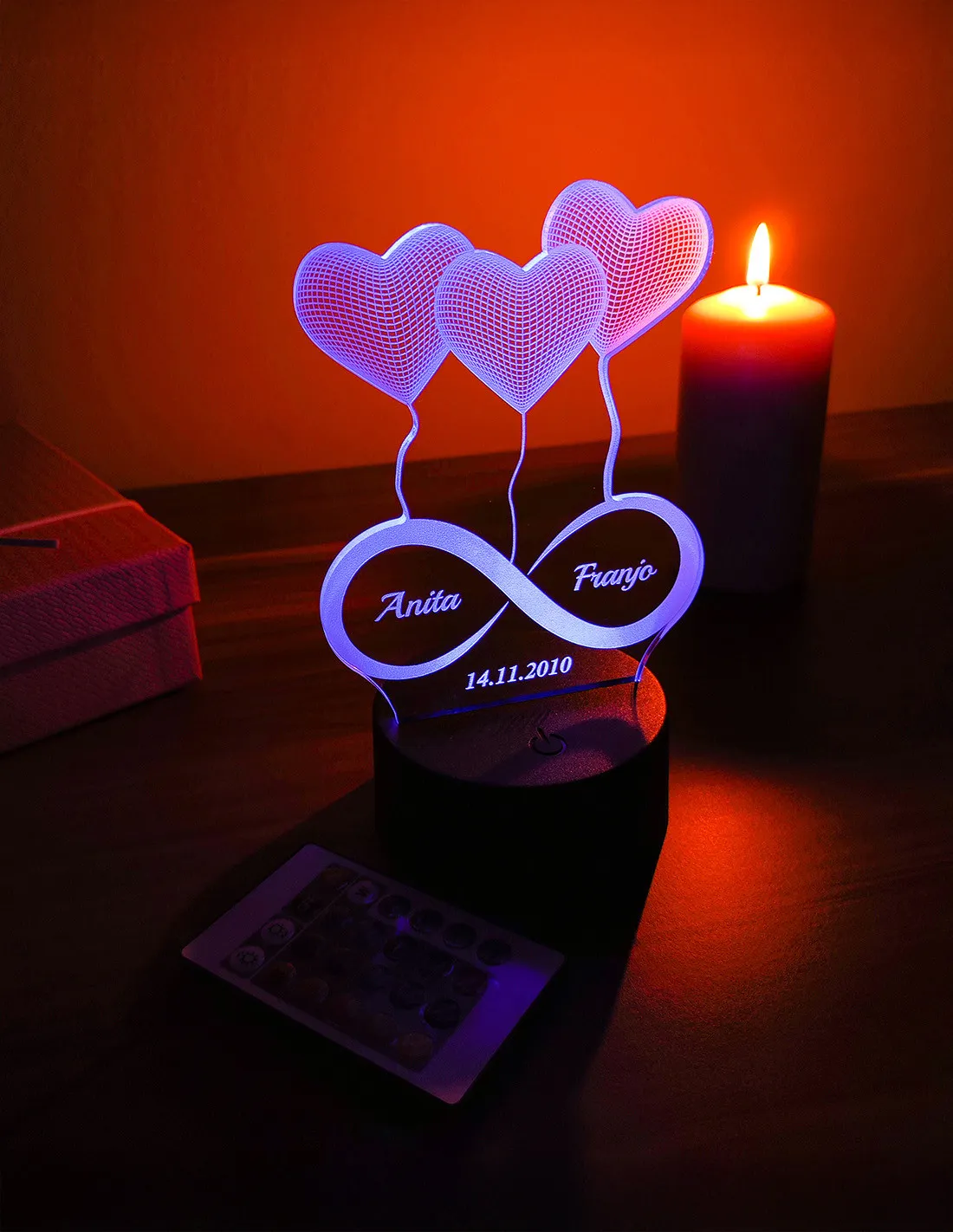 Personalisierte Acrylplatte, LED-Sockel, Fernbedienung, USB-Kabel