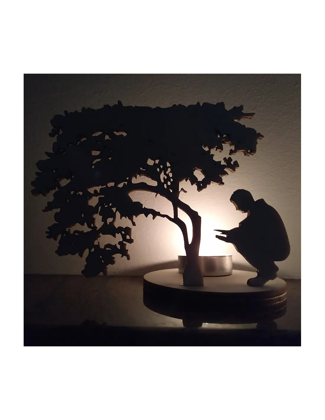 Looking to bring a touch of peace and nature indoors? This laser-cut candle holder captures the quiet charm of a person enjoying the calm of a campfire under a tree. Light a candle behind it, and the scene comes to life with warm, flickering shadows. It’s a cozy detail for your living room, shelf, or bedside table.