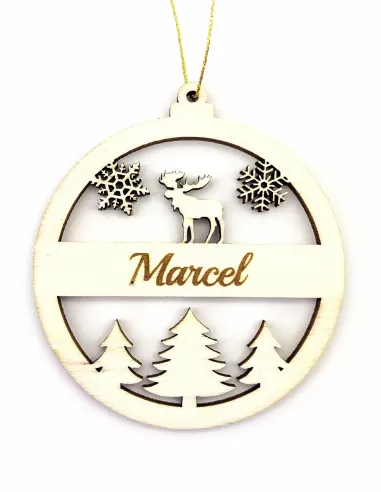 Si buscas una decoración navideña original y con valor sentimental, este adorno personalizado es ideal. Con tu nombre recortado y un diseño con árboles, copos de nieve y un alce, es perfecto para llenar de magia el árbol o hacer que tu regalo destaque.