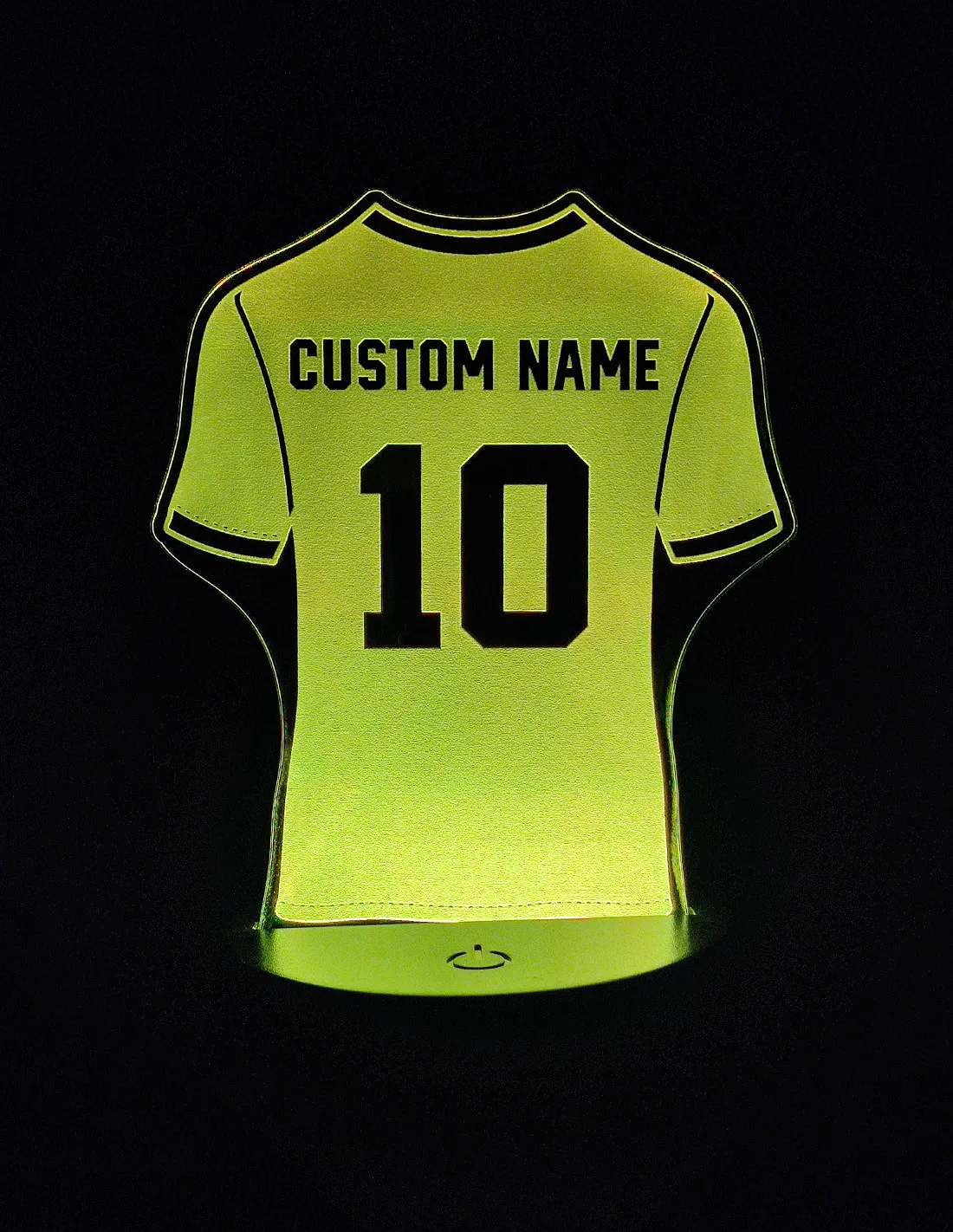 ¿Buscas un regalo que le saque una sonrisa enorme? Esta lámpara LED con forma de camiseta de fútbol, personalizada con su nombre y número favoritos, hará que cualquier cuarto tenga un toque futbolero único.