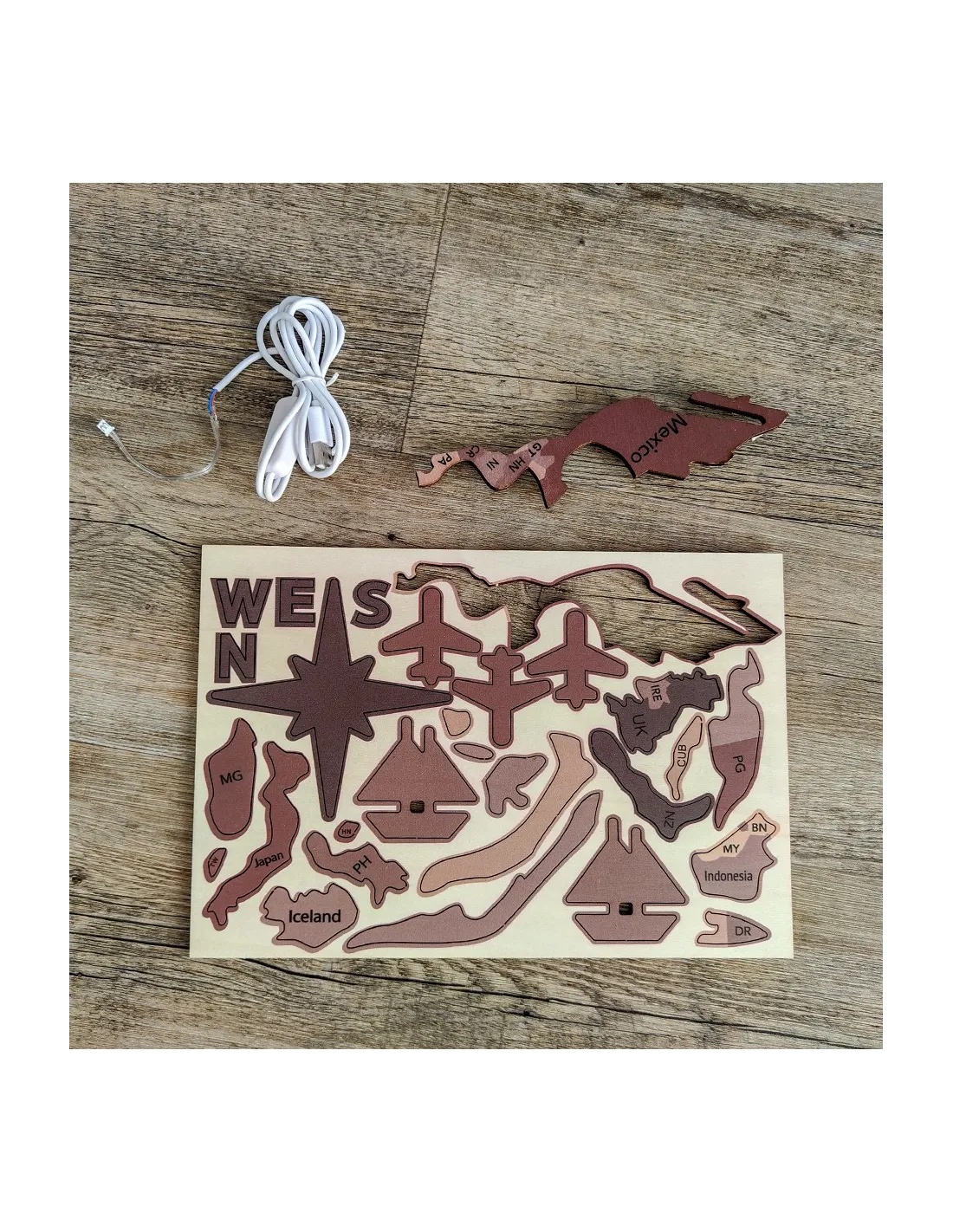 Este mapa mundial de madera con luz LED no solo decora, también transforma el ambiente. De día es elegante y detallado, y al caer la noche cobra vida con una suave luz de fondo. Perfecto para quienes sueñan con viajar o simplemente buscan algo diferente en su decoración.