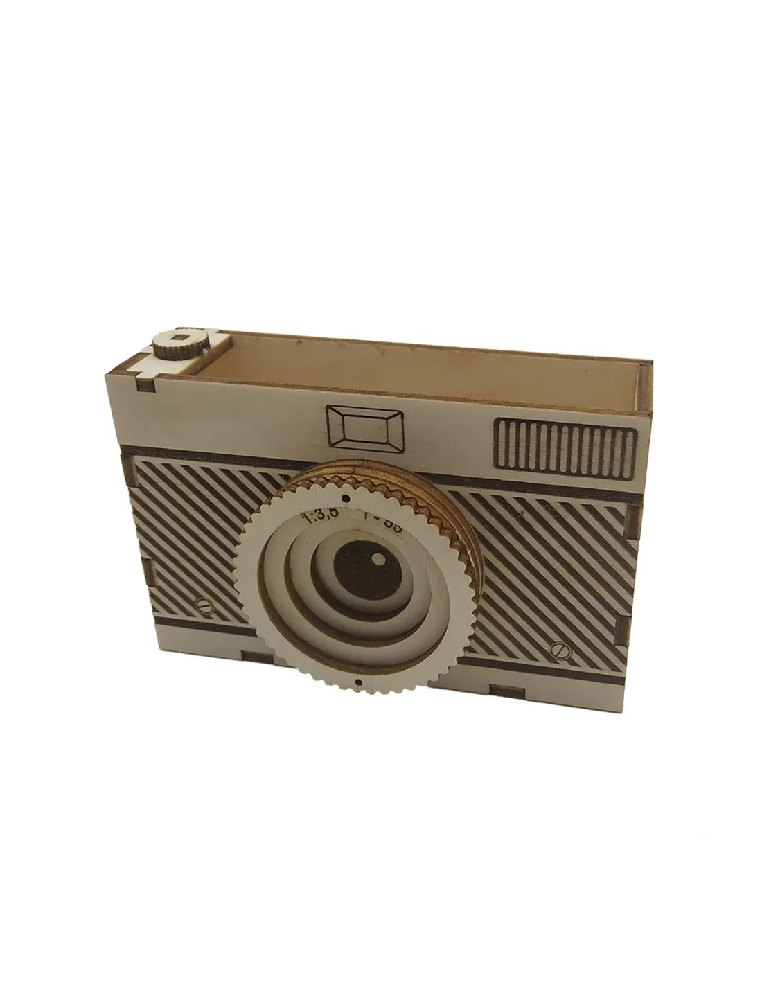 Lápices, rotuladores, reglas, pinceles… todo queda recogido mientras tu escritorio gana personalidad. El grabado frontal simula el objetivo y los detalles de una cámara clásica, así que además de útil, decora.
