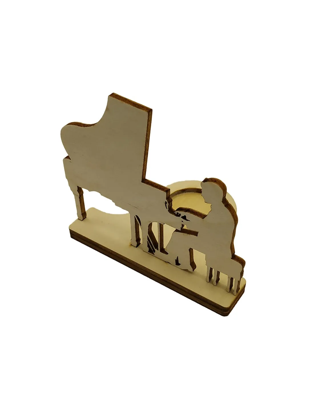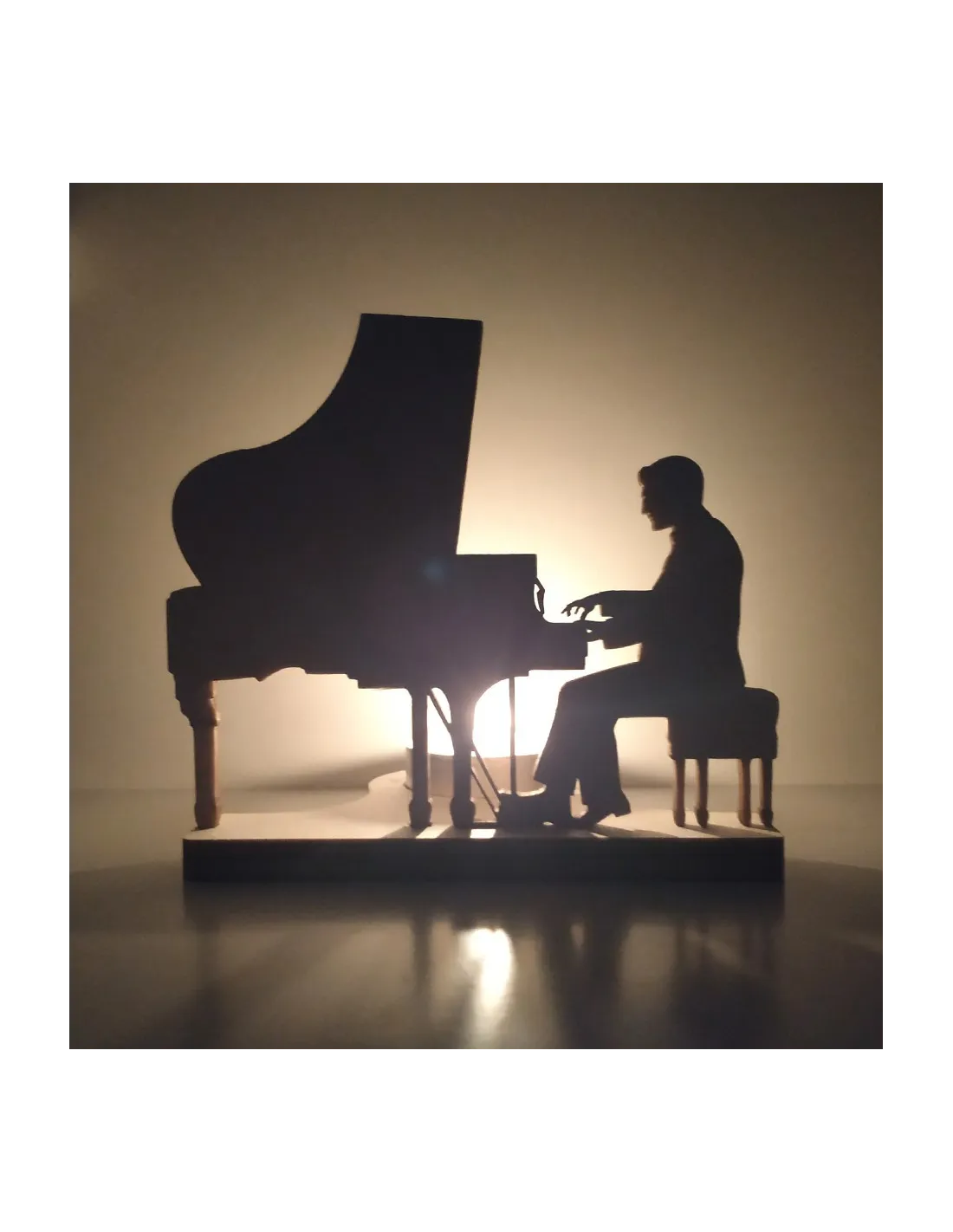 Este portavelas con silueta de pianista al piano de cola crea una atmósfera tranquila y elegante. Perfecto para amantes de la música, este diseño transforma una simple vela en una experiencia visual con sombras cálidas y envolventes.