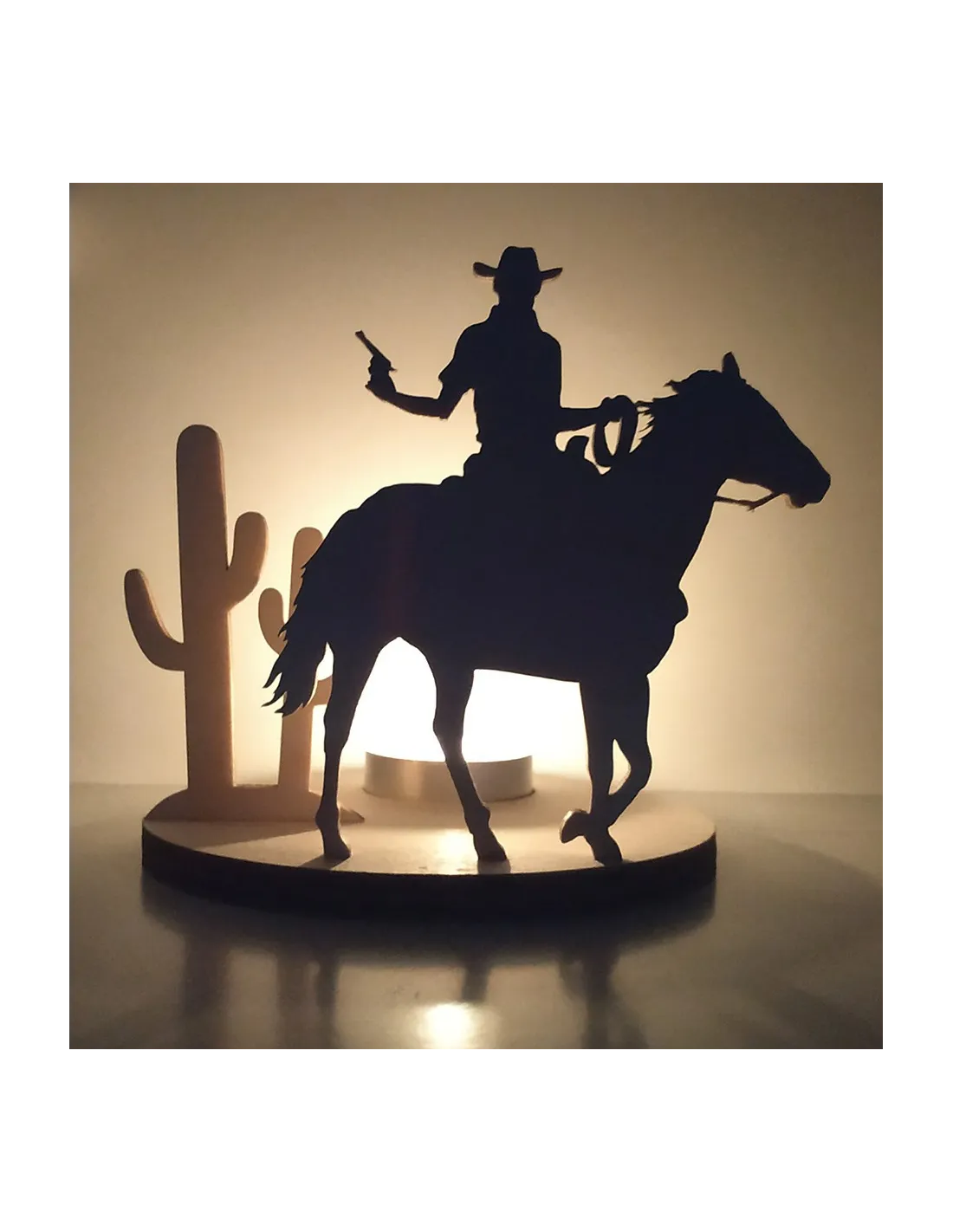 Este portavelas con silueta de vaquero montado a caballo junto a unos cactus crea una escena digna de película del oeste. Al encender la vela detrás, el conjunto cobra vida con sombras únicas que llenan el ambiente de carácter y calma.