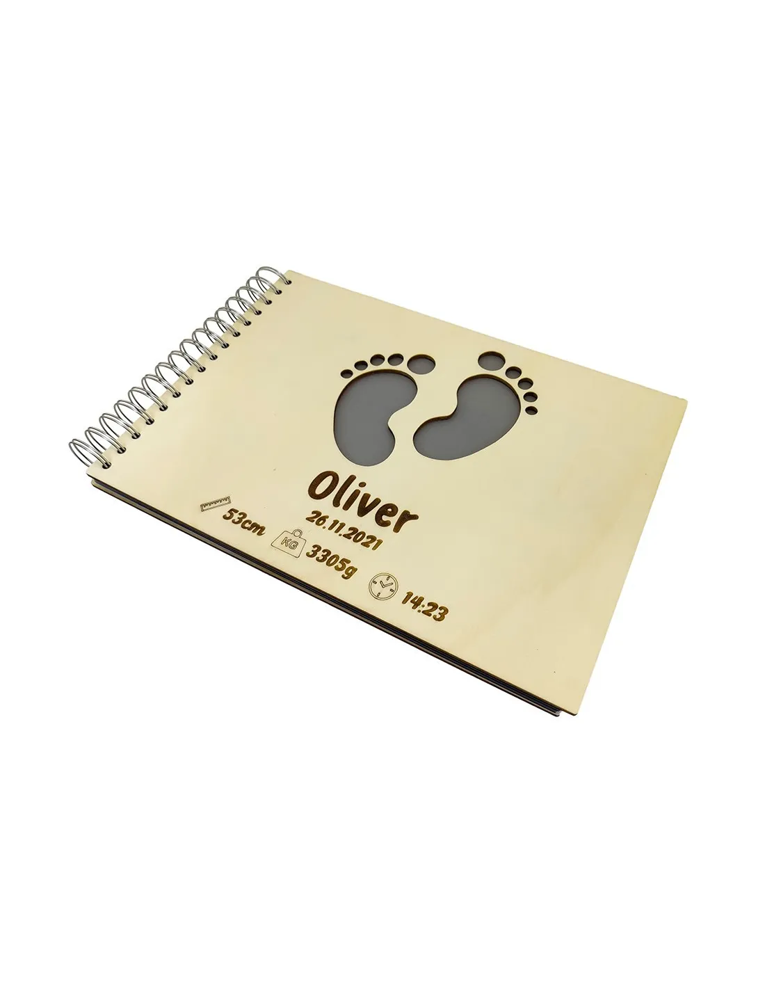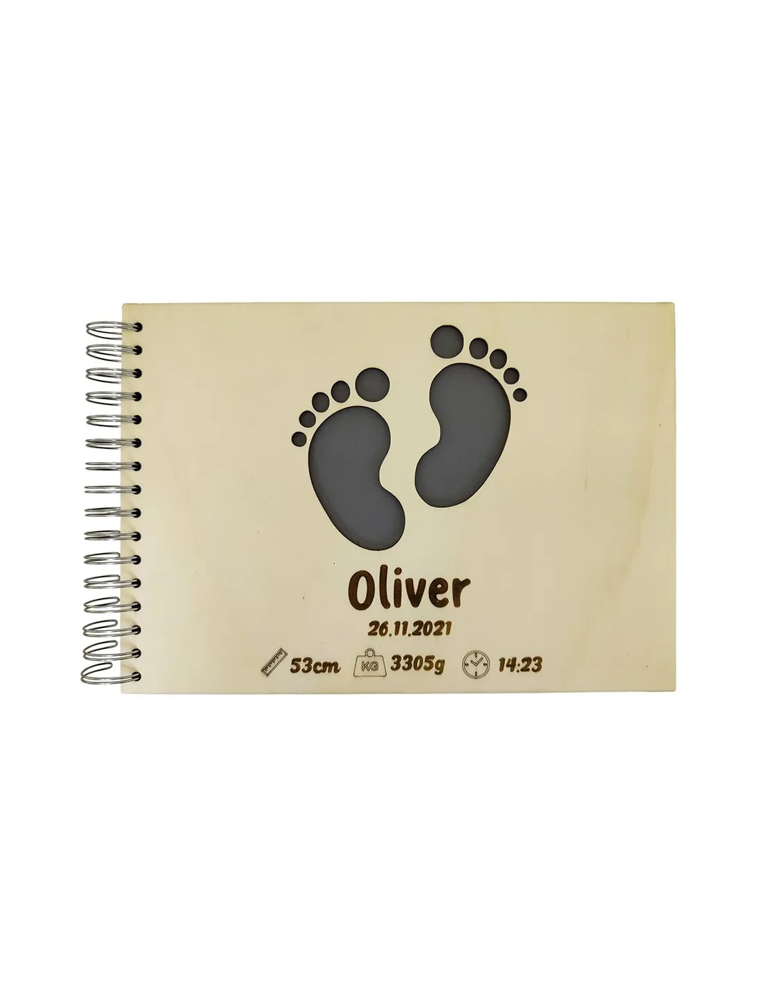 N'oubliez pas de sauvegarder votre personnalisation pour pouvoir l'ajouter au panierTu cherches une belle façon de conserver les premiers instants de ton bébé ? Ce carnet photo en bois avec empreintes de pieds est fait pour ça. Personnalisable avec le prénom, la date de naissance, la taille, le poids et même l’heure – il devient un trésor unique à feuilleter au fil des années.