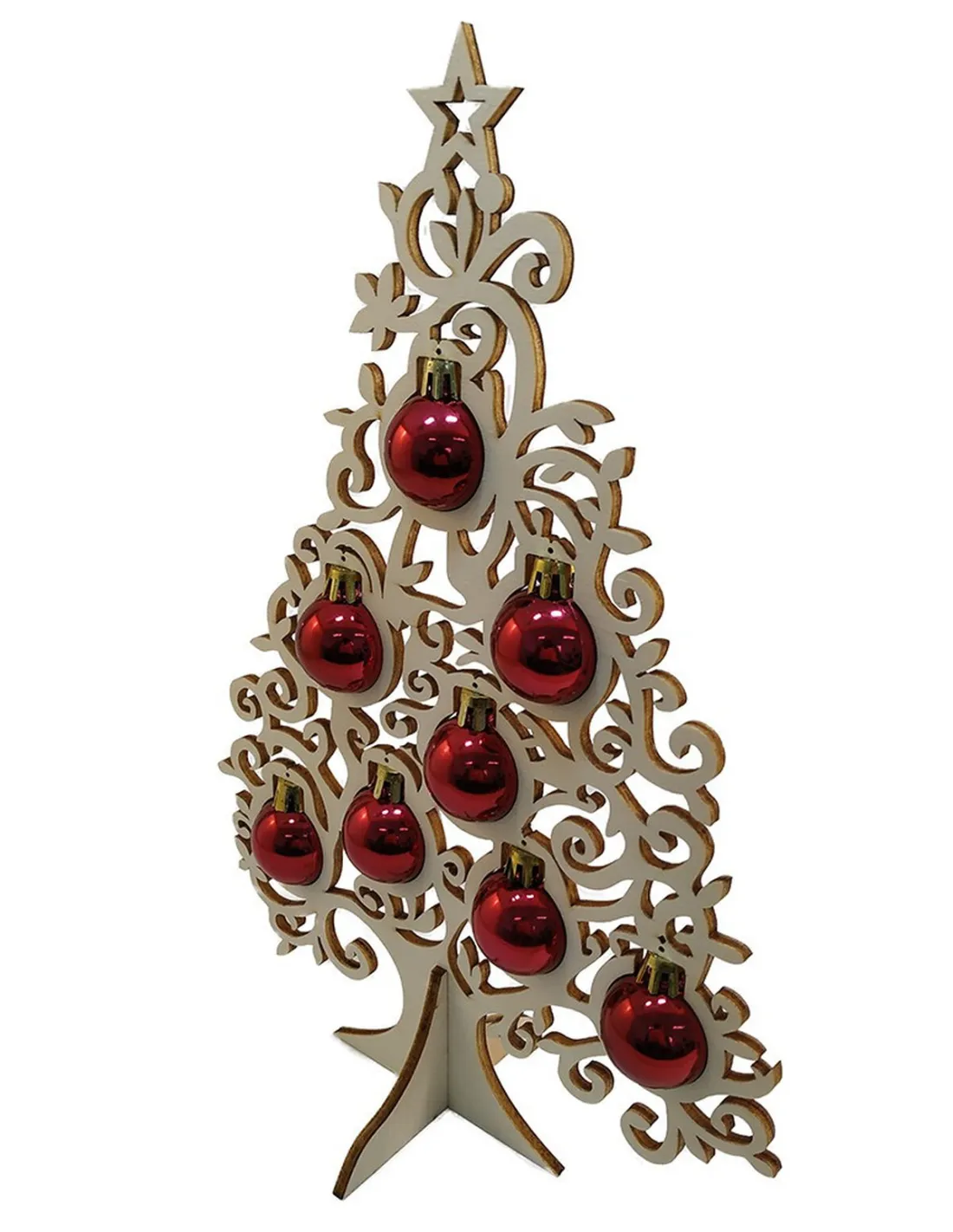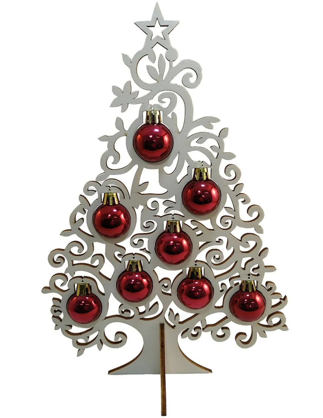 Fabriqué en deux pièces de contreplaqué de 4 mm, ce sapin tient bien droit et s’intègre partout : table, étagère, comptoir, vitrine. Les boules de Noël (incluses) complètent le look et apportent la touche brillante qu’on aime en décembre.