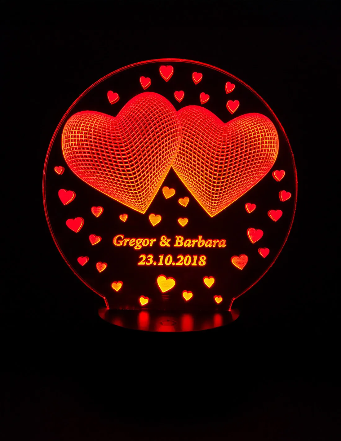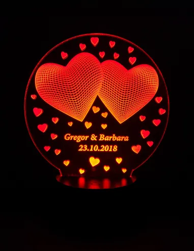 Tu cherches un cadeau romantique vraiment unique ? Cette lampe LED personnalisée avec deux cœurs lumineux et vos prénoms est un superbe symbole de votre amour éternel – parfaite pour un anniversaire, un mariage ou la Saint-Valentin.
