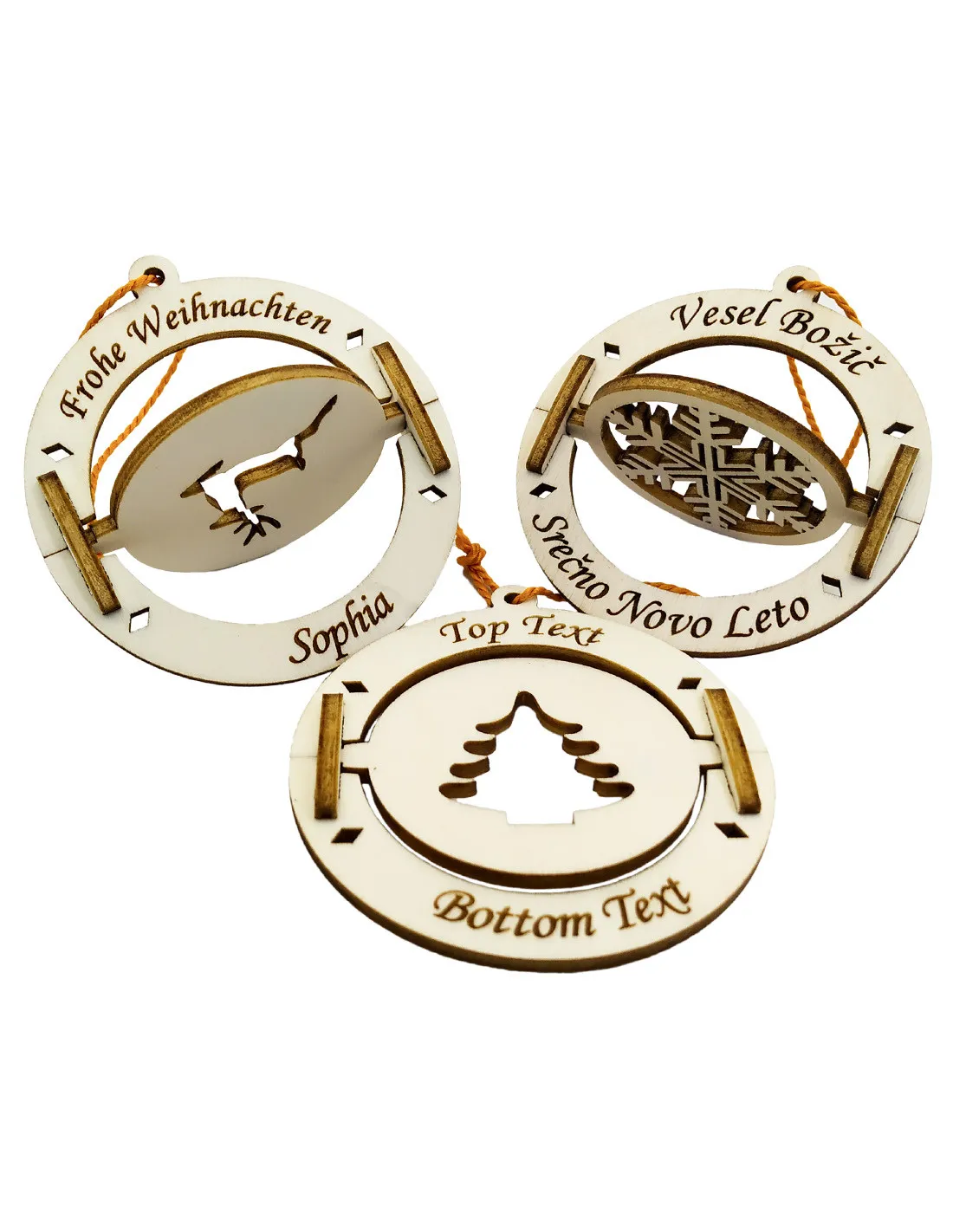 Želiš ukras koji je istovremeno poseban i zabavan? Ovaj personalizirani božićni ukras ima rotirajući središnji dio i tvoj tekst na vrhu i dnu. Biraj između tri motiva — pahulja, jelka ili sob — i učini bor ili poklon još osobnijim.