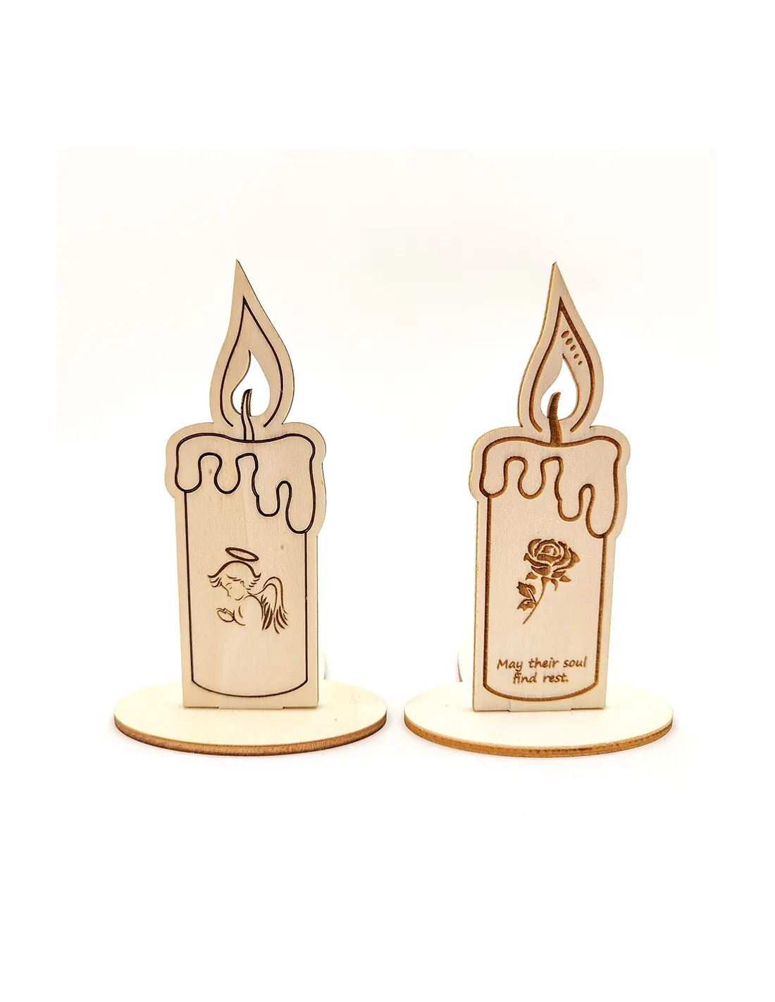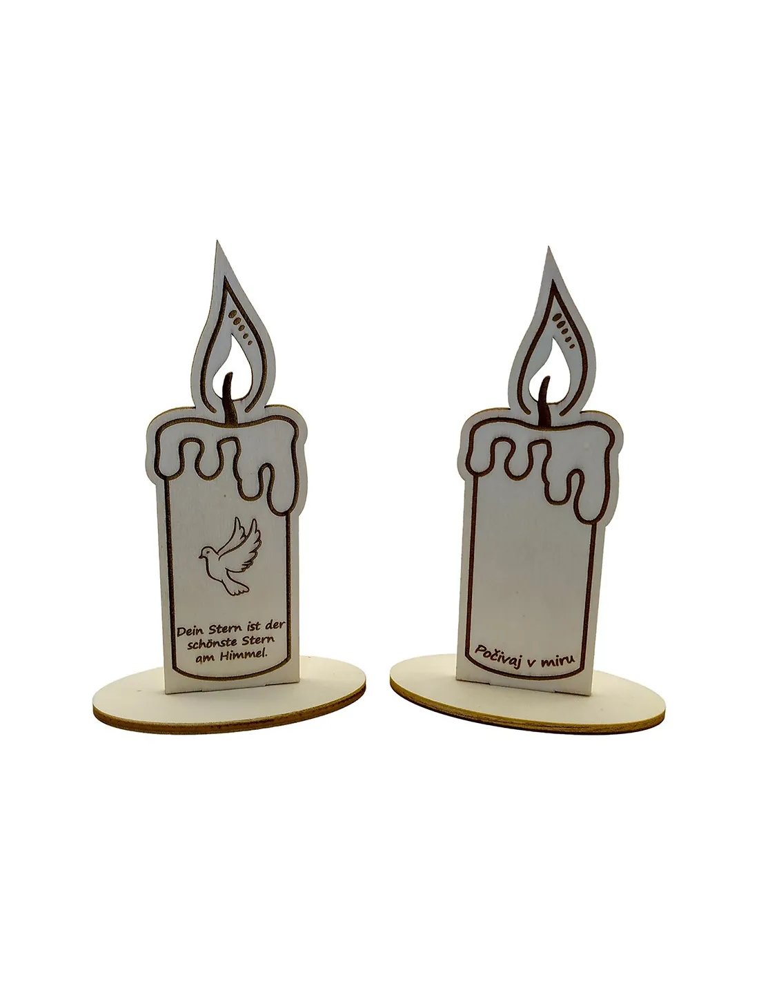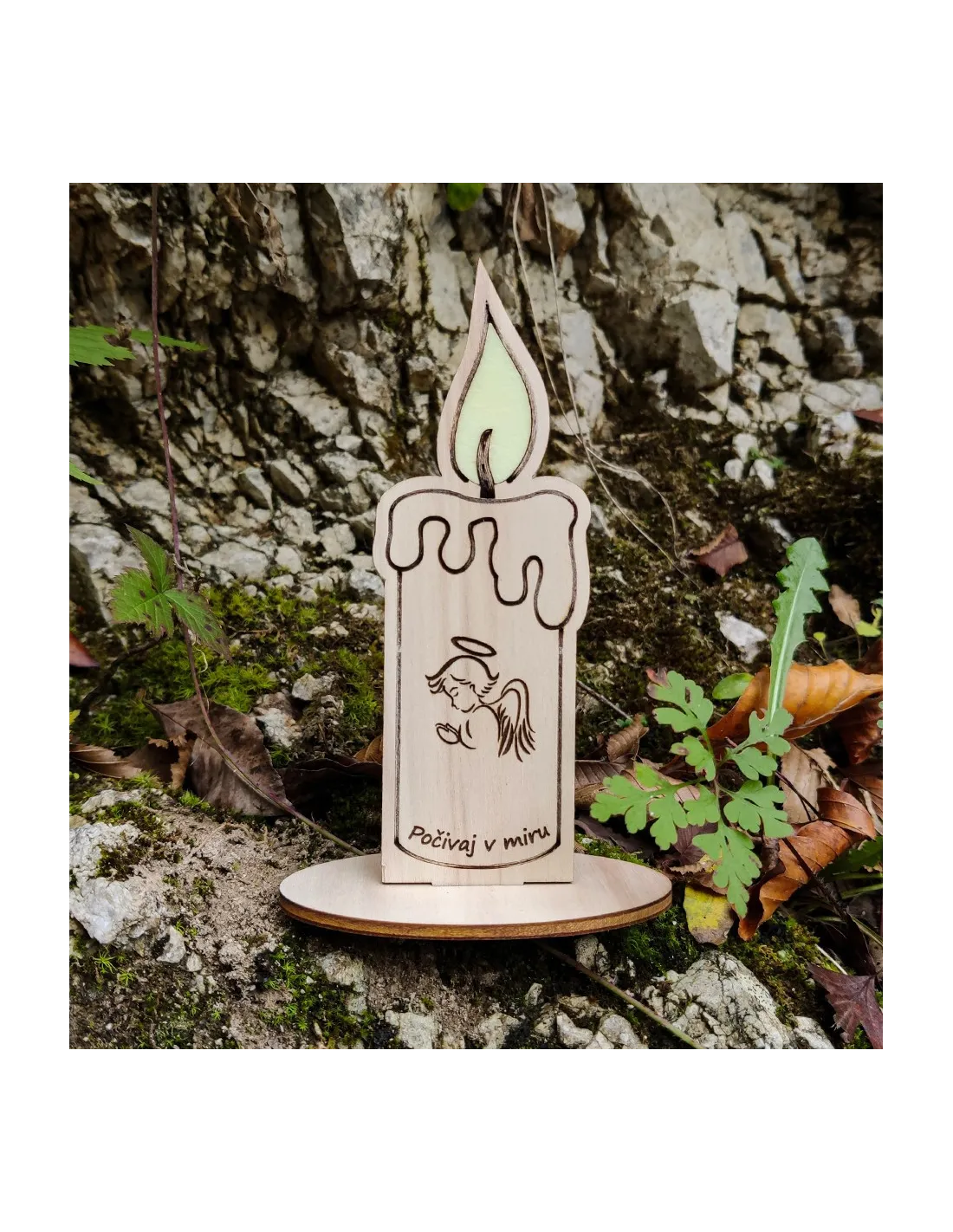 Ova drvena svijeća sa stalkom savršena je za one koji žele ostaviti jednostavnu, ali dugotrajnu uspomenu na grobu voljene osobe. Ne topi se, ne troši i ne gasi – a svaki motiv možeš dodatno personalizirati kratkim tekstom. Uz to, možeš odabrati i opciju plamena koji svijetli u mraku.