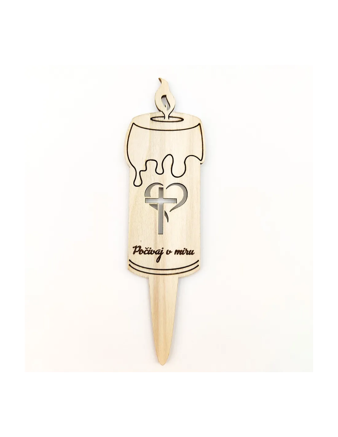Ova drvena svijeća s motivom križa unutar srca jednostavan je, ali snažan način da ostaviš trag i uspomenu na voljenu osobu. Ne topi se, ne gasi i može sadržavati tvoju osobnu poruku. Idealna za grobove, kapelice ili spomen-prostore.