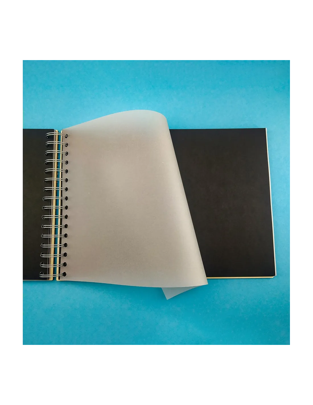 - Potpuna sloboda unutar: Prazne A4 stranice i paus papir između njih – slaži slike i tekstove kako god želiš.